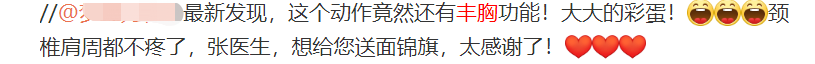 网友:最新发现,这个动作竟然还有丰胸功能!大大的彩蛋!颈椎肩周都不疼了,张医生,想给您送面锦旗,太感谢了!