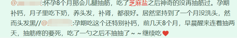 网友:怀孕8个月那会儿腿抽筋,吃了芝麻盐之后神奇的没再抽筋过。孕期补钙,月子里吃下奶,养头发,补肾,都很好。居然坚持到了一个月没洗头,然而头发黑。孕期吃这个还特别补钙,前几天8个月,早晨醒来连着抽两天,抽筋疼的要死,吃了一勺之后不抽抽了~~继续吃。
