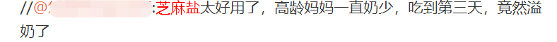 网友:芝麻盐太好用了,高龄妈妈一直奶少,吃到第三天,竟然溢奶了。