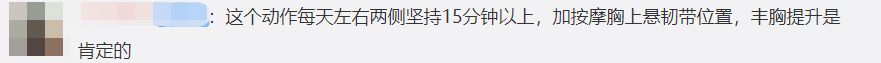 网友:这个动作每天左右两侧坚持15分钟以上,加按摩胸上悬韧带位置,丰胸提升是肯定的。