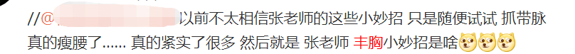 网友:以前不太相信张老师的这些小妙招 只是随便试试 抓带脉真的瘦腰了…… 真的紧实了很多 然后就是 张老师 丰胸小妙招是啥?这下你八十万粉丝都知道我在求丰胸妙招了 你还不回复我吗老师?