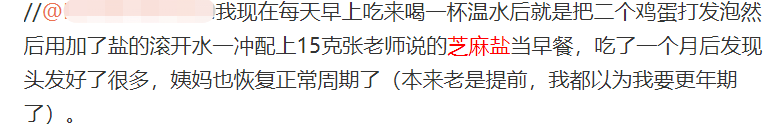 网友:我现在每天早上吃来喝一杯温水后,就是把二个鸡蛋打发泡然后用加了盐的滚开水一冲配上15克张老师说的芝麻盐当早餐,吃了一个月后发现头发好了很多,姨妈也恢复正常周期了(本来老是提前,我都以为我要更年期了)。
