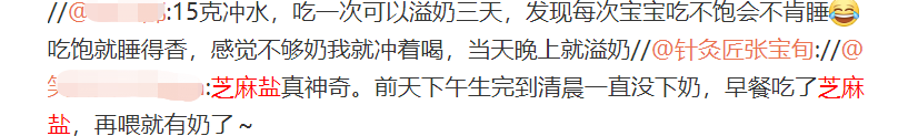 网友:芝麻盐真神奇。前天下午生完到清晨一直没下奶,早餐吃了芝麻盐,再喂就有奶了~