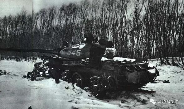 (珍宝岛事件中被炸毁履带的苏军T-62坦克)▼