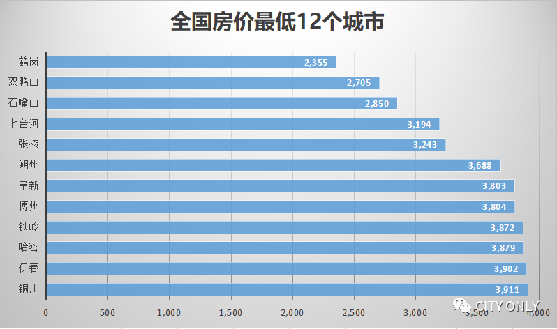 鹤岗的房价据2020年8月的统计数据,确实是排名垫底,倒数第一。那么也就意味着这片大陆地级以上的城市,已经没有低于2000的房价。同是2000+水平徘徊的还有双鸭山、石嘴山;12个城市中其他的9个城市的房价处于3000+的状态。