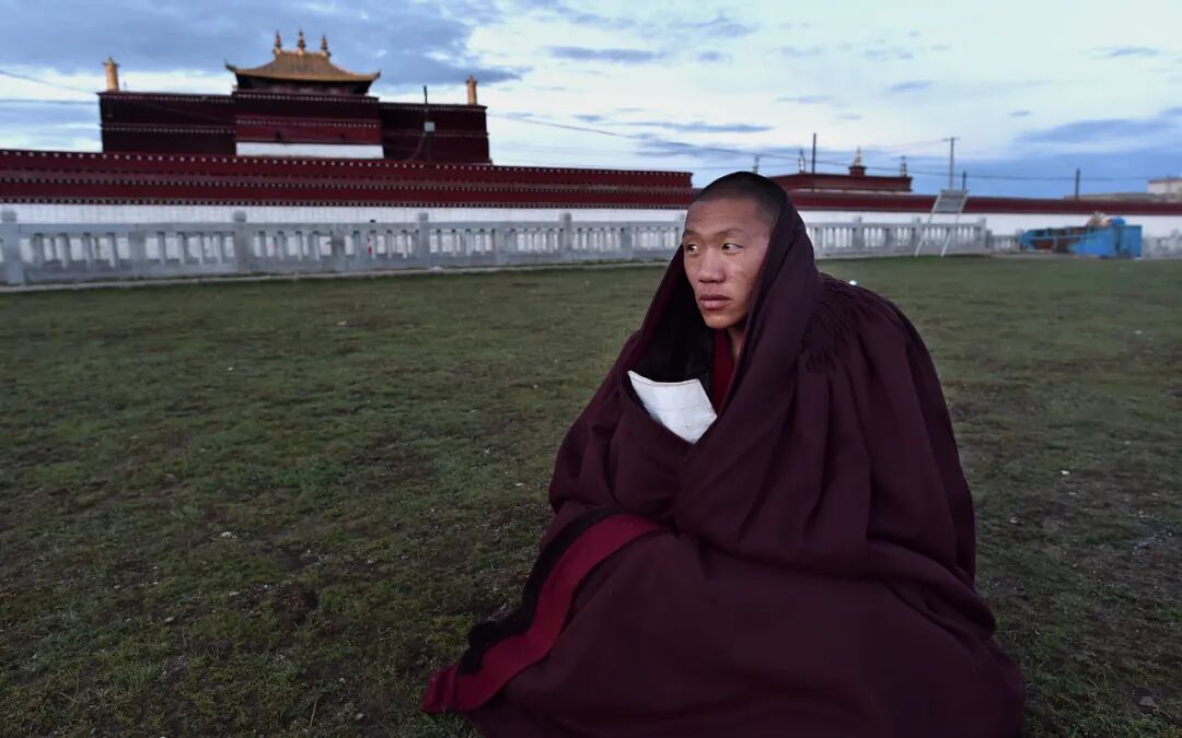 (清晨孝登寺外的草地上一名僧人正在诵经)▼