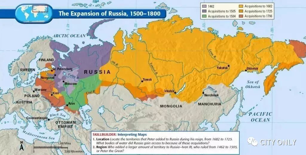 沙俄发源于斯拉夫民族的基辅罗斯(今乌克兰Kyiv/Київ/基辅),并不与东方清政权接壤。1533年沙皇伊万四世(俄罗斯首位沙皇-恐怖的伊万)即位,于1547年加冕为沙皇并展开了向东和向西的对外扩张。1547-1552年远征灭亡了喀山汗国,1556年吞并阿斯特拉罕汗国,随即大诺盖汗国和巴什基尔亚也被纳入版图,至此北高加索归顺伊万四世,沙俄成为多民族国家。