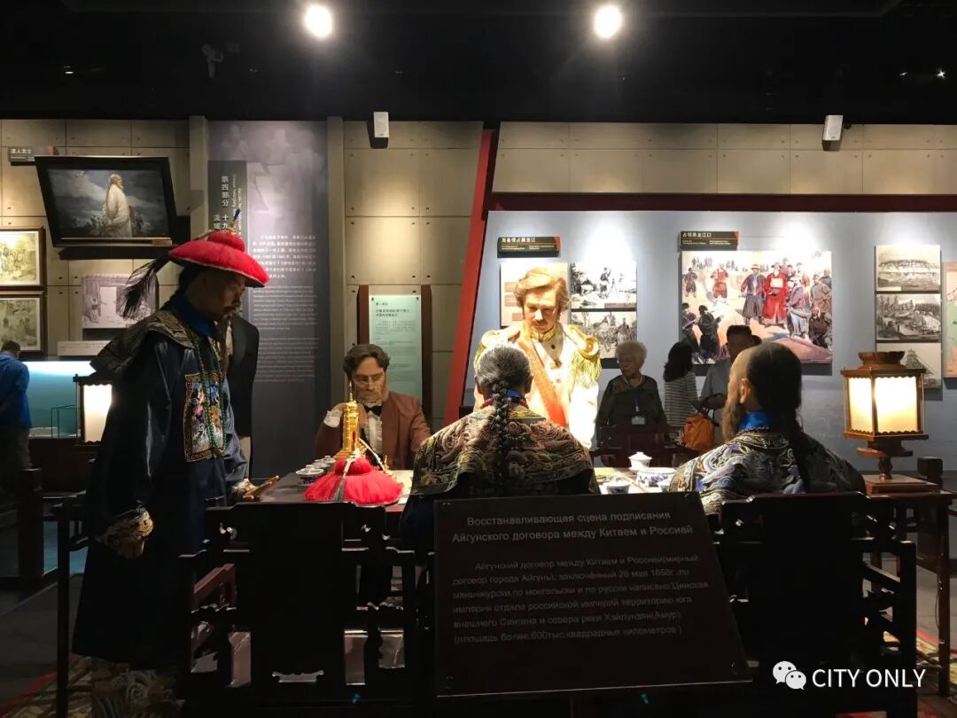 瑷珲从唐朝起便是重要的驿站,17世纪遭到沙俄哥萨克骑兵的严重侵扰,但彼时的强盛让清政府在两次雅克萨自卫反击战中取得胜利,并签订了《尼布楚条约》,展览中有逼真的签订场景的再现。经过半个多世纪的和平稳定,瑷珲成为黑龙江中上游的中心城市,但混乱僵化的统治所导致的国力衰微让清政府无力抵抗此后沙俄的入侵。