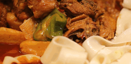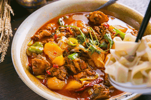 大盘鸡!这是到达沙湾首要体验的美食。大盘鸡的历史尚未超过50年,也并非维吾尔族、哈萨克族、回族等当地少数民族的传统菜肴,却是绝大多数外地人知道和接触新疆美食的必点菜肴。如何诞生的这道菜,据说某日一位长途车司机师傅在一家餐馆点了份红烧鸡块,要求放点土豆和面条,于是便有了大盘鸡这道菜,传说中的这家店就是在沙湾。从此,大盘鸡从巧妙合成的一道菜慢慢发展成为新疆美食的符号,发明这道菜的沙湾更是名声大噪,不但有大盘鸡一条街,每年9月还会举办个沙湾大盘美食文化节。