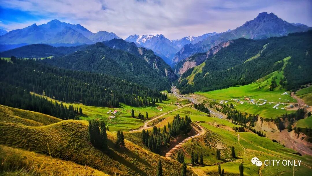 博尔通古乡的鹿角湾位于天山北坡,因马鹿常年在这一带繁衍生息,每年脱落大量角壳,而得此名,但这可不代表你能在此看到鹿角壳。鹿角湾是天山北麓最好的牧场之一,8月中旬塔城巴尔鲁克山的草原已经“泛黄”,这里仍在天山的雨润下绿颜不改。景区宣称的雪峰冰川、高山裸岩、高山松林、高山草原其实在同一片山体上,站在此山望彼山,一眼揽尽四个自然景观带。