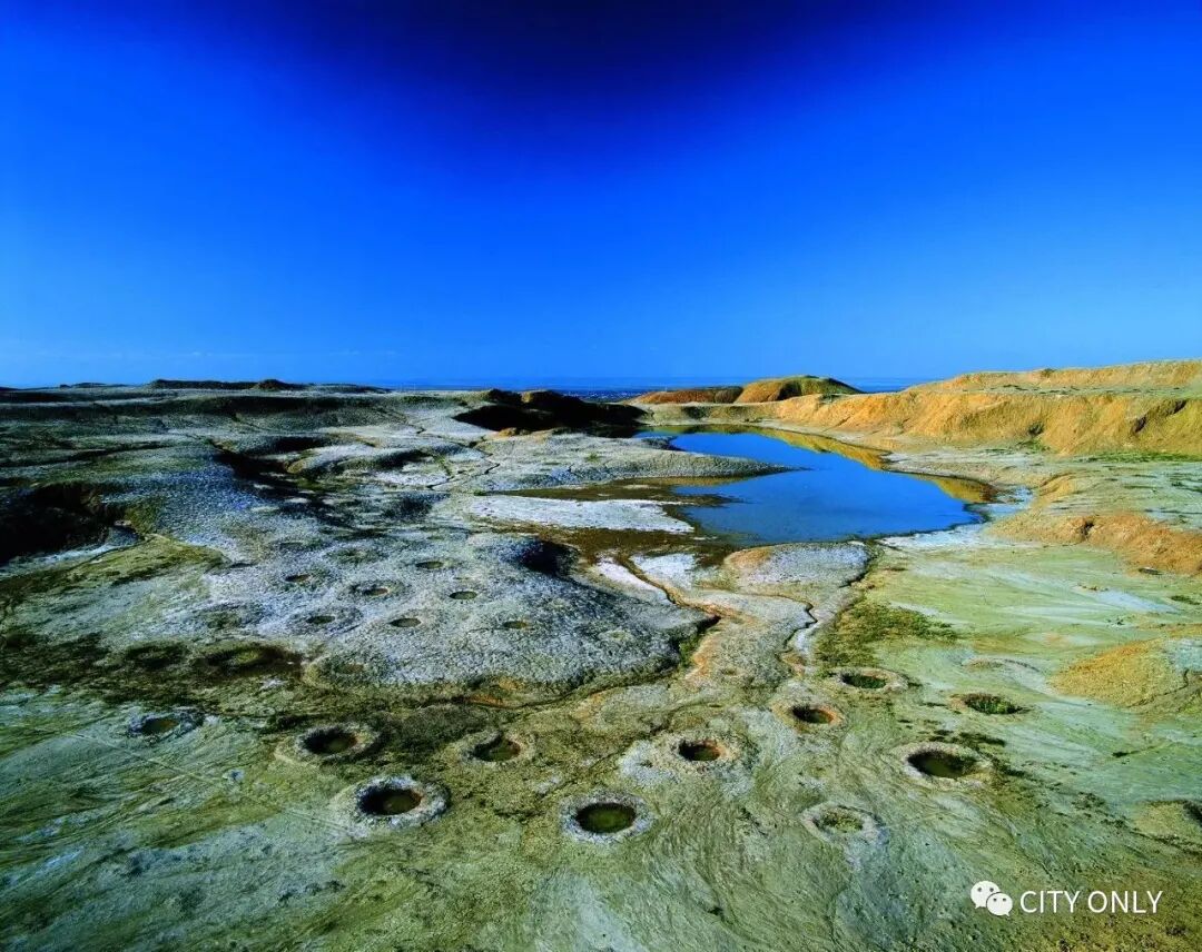 同样在白杨沟,所谓的火山不过是你脚边的一些泥潭,数量不多,最小的仅碗口那么大,泥潭里有泉眼咕嘟咕嘟翻滚着冒泡。当地人说,十多年前这一代的沟谷里满是巨大的泥潭和泥浆河,近年来才逐渐干涸。泥火山形成的原理是地下天然气向地面喷射,天然气和泥浆同时呈泥涡状态涌出。泥火山上有个凉亭,这里可以望见一片黄、绿、灰、红相间的山谷,面积不大但很漂亮,当地人称这里为“国画山”。