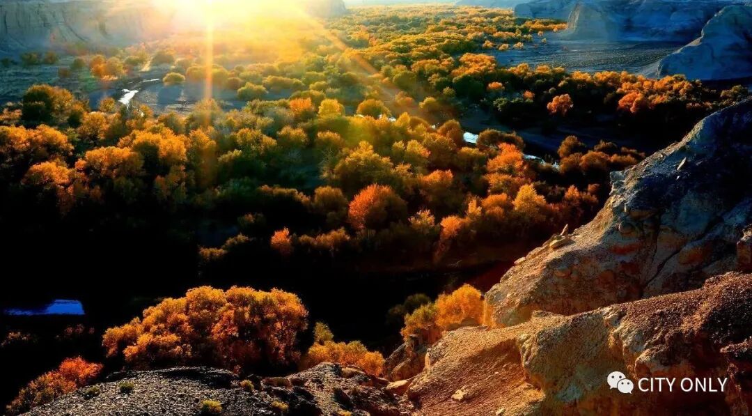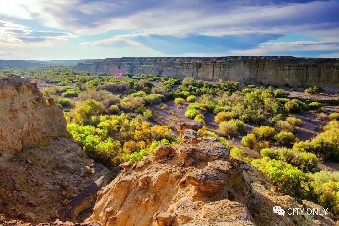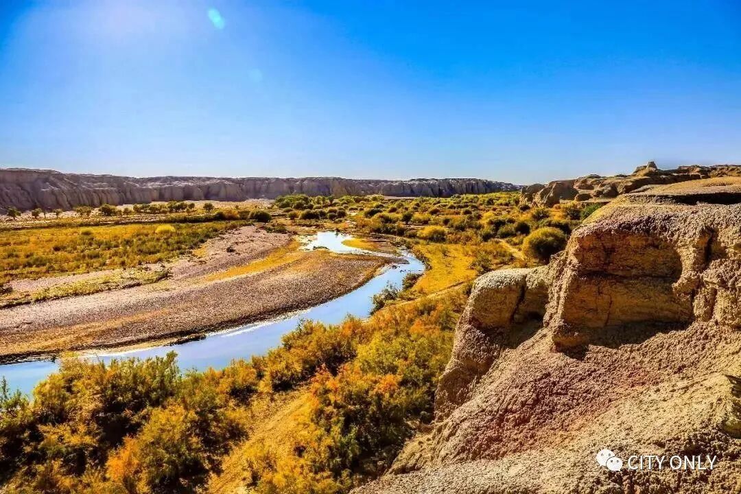就如戈壁中的一条绿色生命带,白杨河大峡谷绵延30公里。5-10米宽的白杨河在谷底蜿蜒流过,两岸生长着胡杨、银灰杨、红柳等植物,峡谷外是浅红色的雅丹地貌。