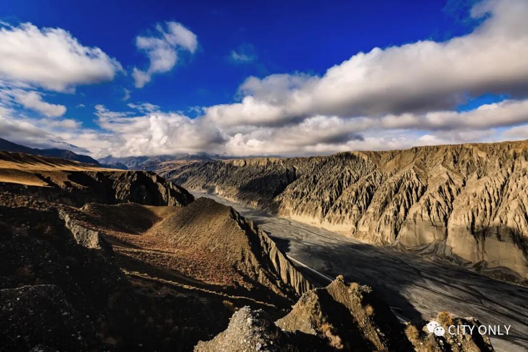 天山的冰川雪水消融后形成了奎屯河,数万年的冲刷形成了一条南北走向长20公里的峡谷。独山子大峡谷是这条峡谷中的一段,从谷底至谷肩大约高200米左右,底层为沙砾石。峡谷槽壁上密布着灰黑色的沟沟壑壑,看上去就像一副长长皱皱的木刻版画,谷底平坦,奎屯河如数条发辫交织流淌。上午是顺着光线,但光线并不能完全体现峡谷的层次感,下午从侧光转为逆光,更适合摄影拍照。