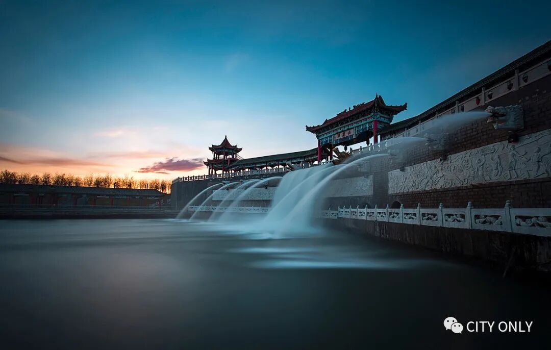 九龙潭位于城市东北角,是利用水位落差形成的8米高的人工瀑布,站在瀑布正上方,看着脚下水流汹涌而至后一泻千里,气势磅礴中也不由让人心生几分怯意。