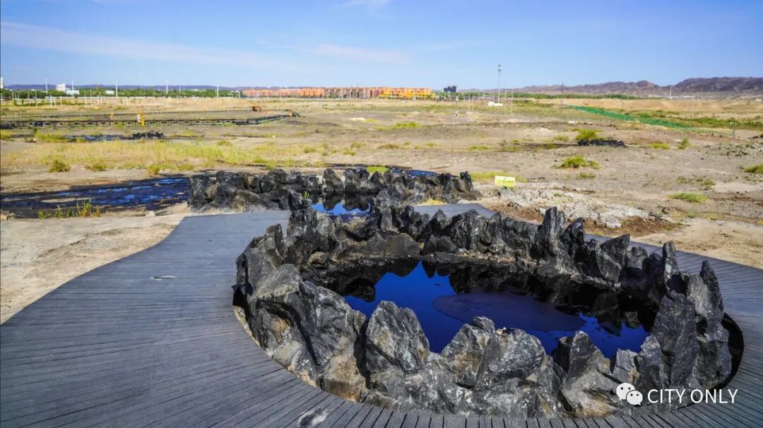 位于市区东北部的黑油山并非是高山,而是一座因地下原油长年外溢,部分挥发后与沙砾、尘土固化形成的沥青丘,这样的地表景观全球仅两处,另一处听说在埃及。景区在沥青丘上设有栈道,沿途可看到众多色泽黝黑的小油沼,油泉眼仍不断向外冒着泡。真的是所谓的“富得流油”。