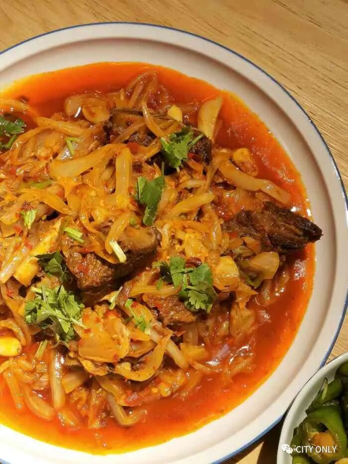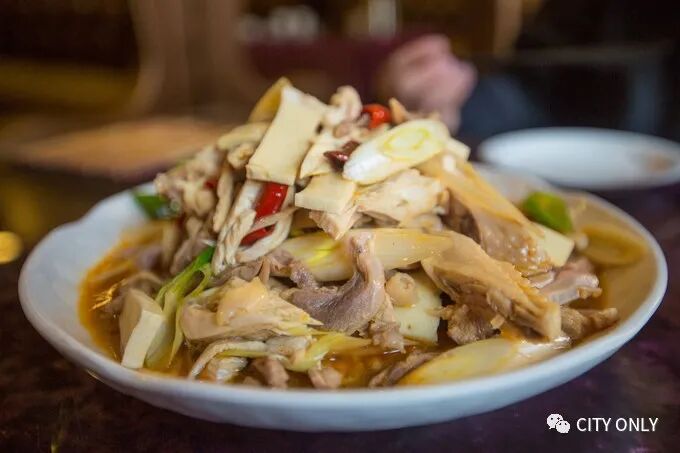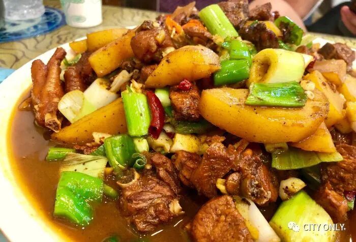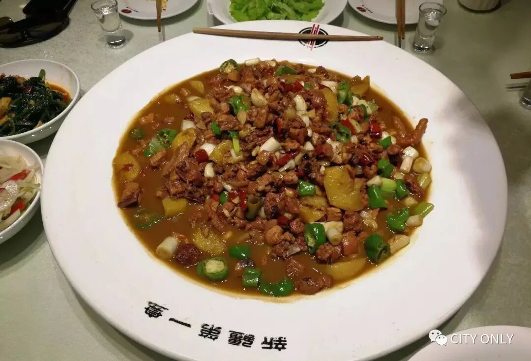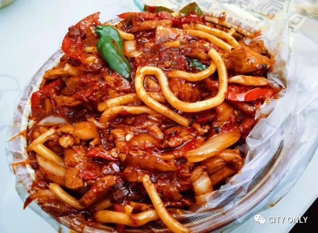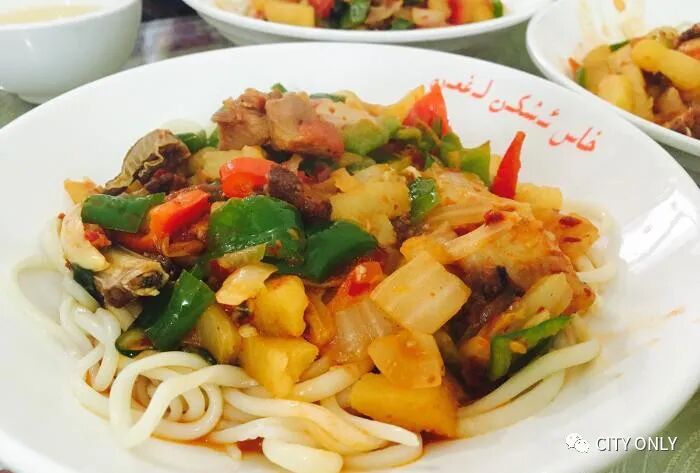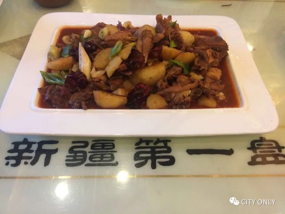 这家店订制的直径1.65米、能装下160公斤大盘鸡的大瓷盘在2005年获得了上海大世界吉尼斯之最。许多人慕名而来,大盘鸡端上来分量也着实够大,鸡肉香嫩、土豆软糯,盘子里还浸润着吸饱了汤汁的馕,再加一份皮带面也不错。