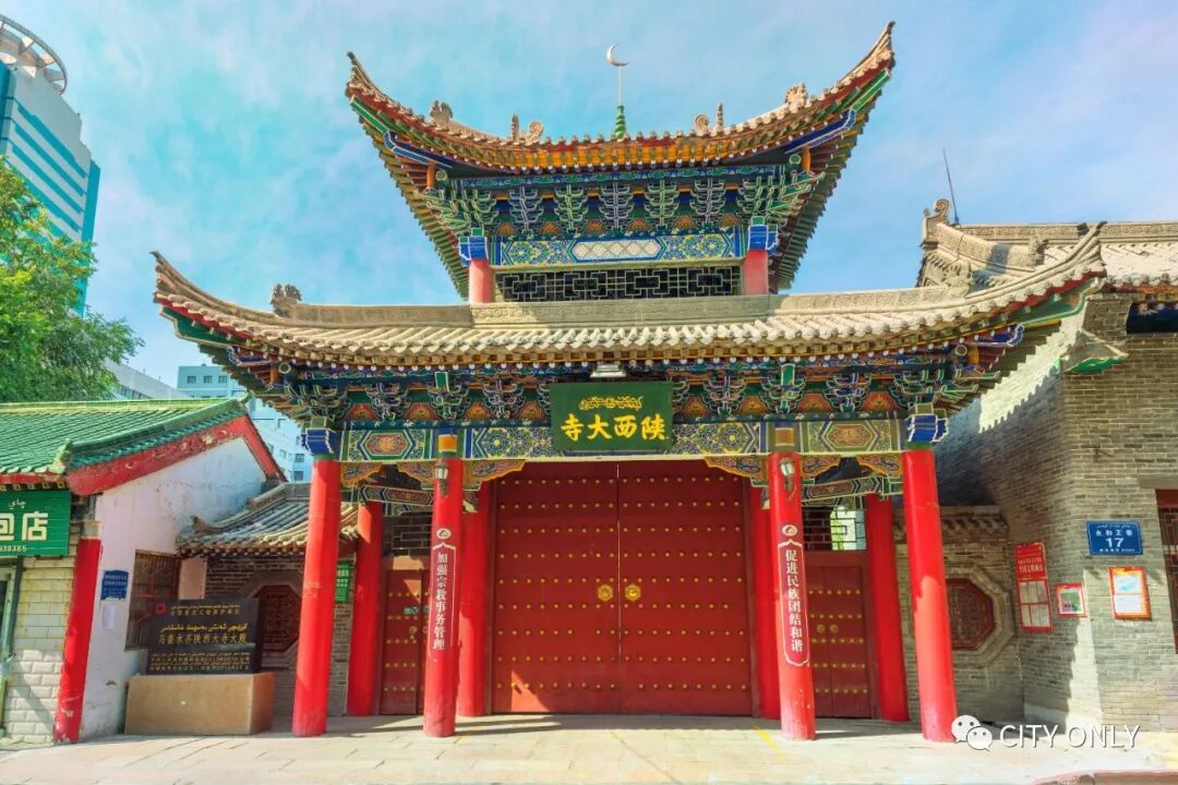 第一眼看到碧色琉璃瓦与朱红色柱子的大殿,大部分人可能意识不到这竟是一座清真寺。这座始建于清朝乾隆嘉庆年间的回族清真大寺,在1906年由陕西回民集资重建,所以又称陕西大寺。大寺颇似中原宫殿,庭院东、南、北均有厅堂,主体建筑是西面大殿,其前部为单檐歇山样式,铺有琉璃瓦顶,走廊支撑有红圆木柱,后部的望月楼则为上八下四的重檐式的“八角楼”。但入口中式门楼上的新月则是显著的伊斯兰风格。