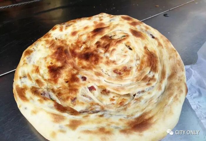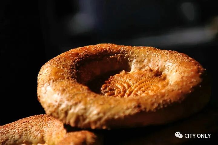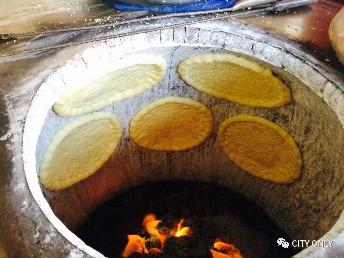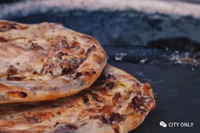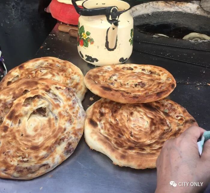 打馕的师傅边做边卖,随着牛羊肉粒被烤得滋滋响,色泽金黄的肉馕出炉后香味四溢。听师傅说出炉后15分钟口感最好,也有爱趁热吃的。一口咬下去,热气腾腾、满口生香,味觉得到极大的满足。