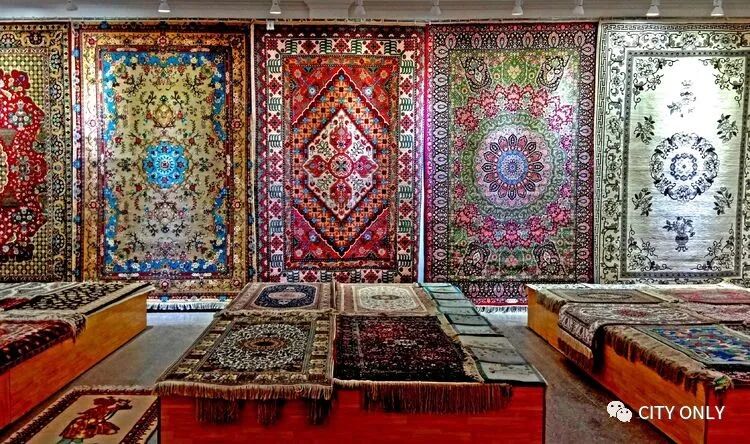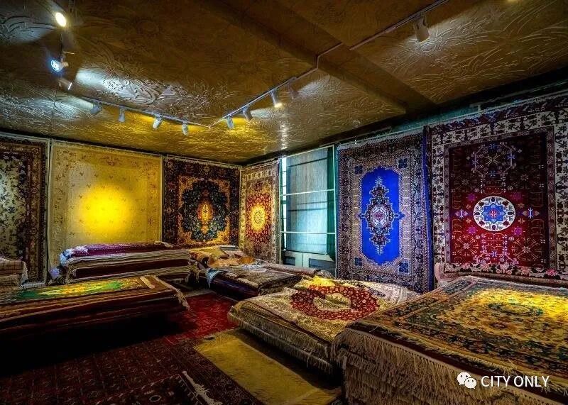从春秋时期开始,和田地区就有制造地毯的历史了。在漫长的时光中,和田地毯慢慢融合了中亚、蒙古、藏地的制作工艺,形成了独有的风格。在人民大会堂的《天山颂》大型挂毯就是和田地毯的完美展示。博物馆中有些从民间收集、具有百年历史的地毯值得一看。