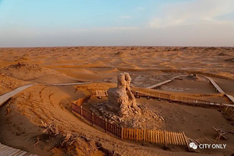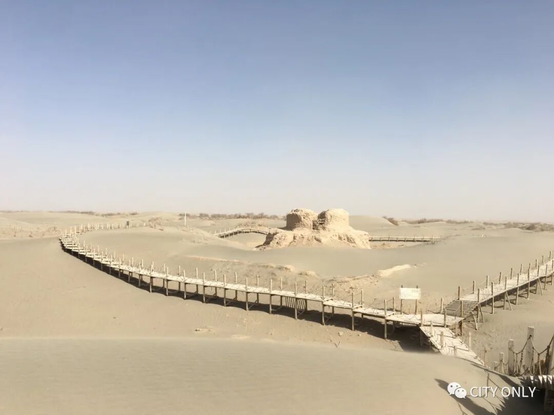 玛利克瓦特故城是兴盛于西汉初的丝绸之路重要城镇,据说是《法显传》中记载的屈摩帝大寺。这里出土的泥塑佛像和壁画残片大都是魏晋时期至唐代的遗物。故城的面积很大,空旷的地表上散落着被严重风蚀的建筑,进入这片区域时留意脚下的碎陶片,当然这些是不可以带走的文物。