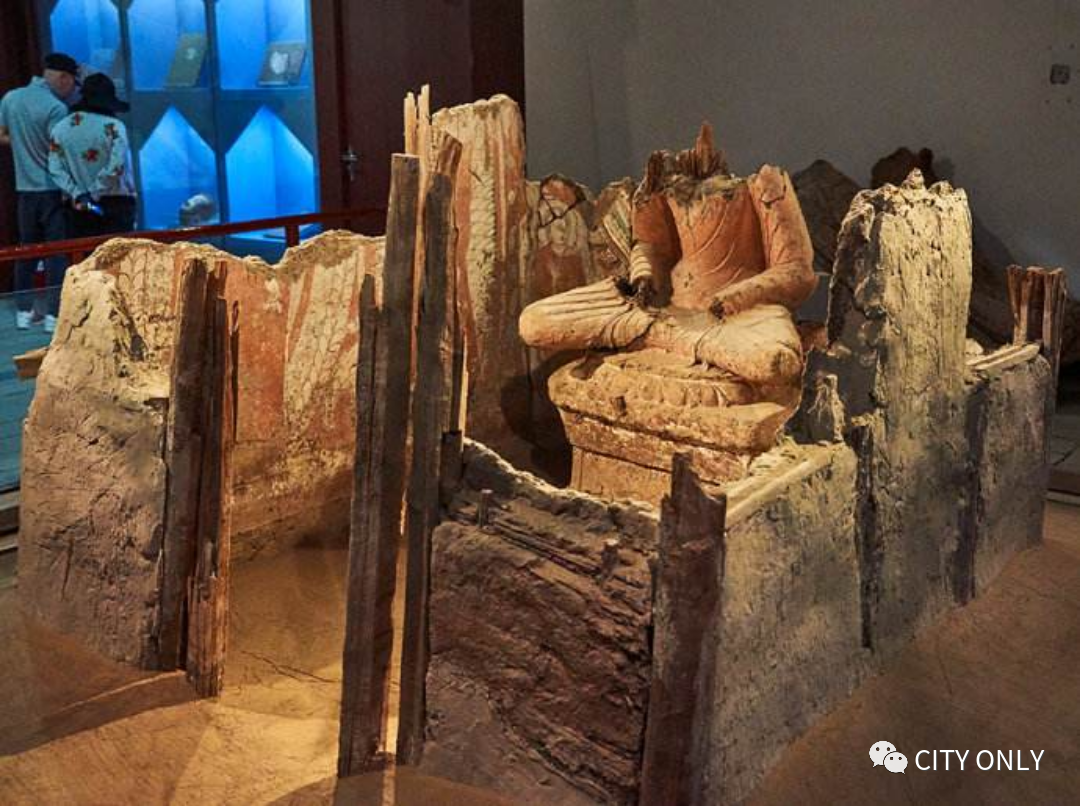 (达玛沟佛教遗址博物馆中珍藏的小佛寺/托普鲁克墩1号遗址出土的毗沙门天)▼