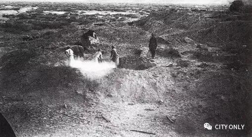 (1906年伯希和及其考察队员在图木舒克寺院遗址考古发掘现场)▼