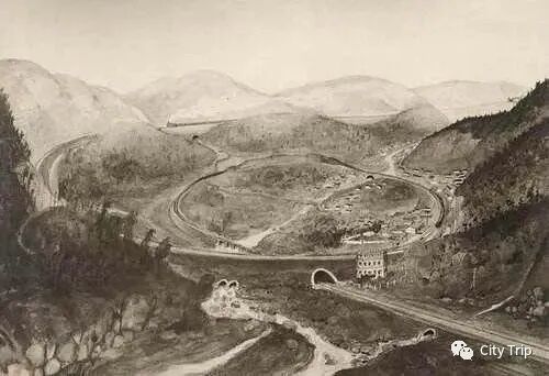 (百年前的兴安岭螺旋铁路展线素描/301国道俯瞰兴安岭螺旋铁路展线)▼
