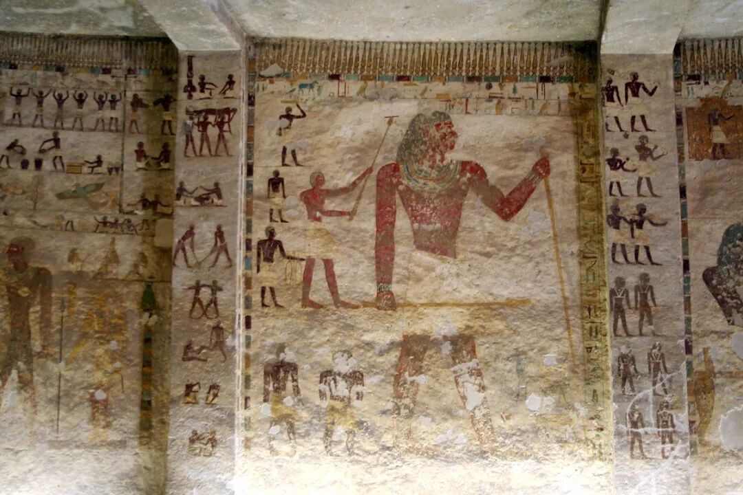 (埃及贝尼·哈桑Beni Hasan陵墓壁画/注意左侧柱子上至下第4组)▼