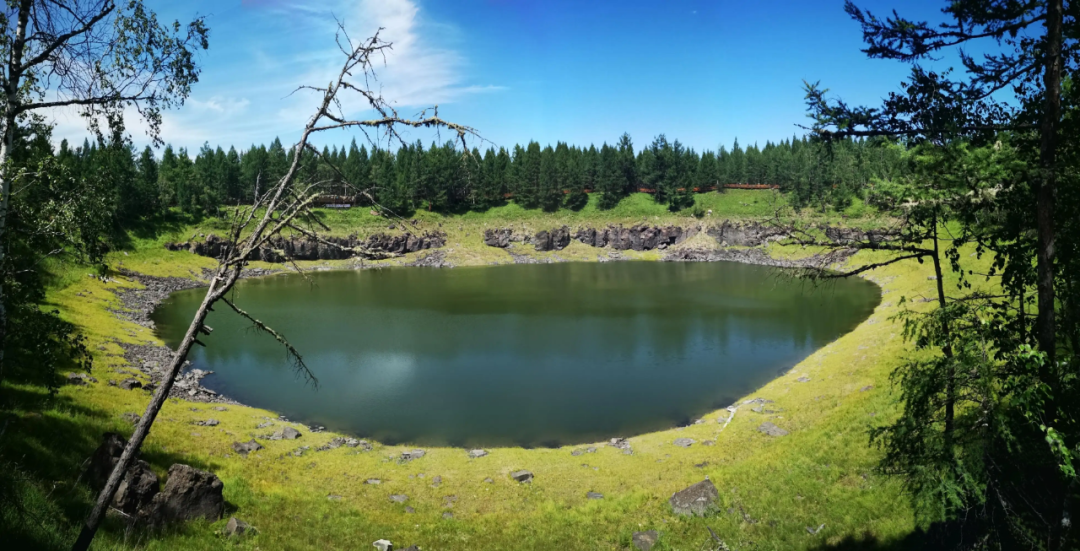 这处地池低于地平面,形成于10万年前熔岩湖后期陷落的火山口积水。景区修了木栈道围绕一圈儿,没什么特别之处,即停即走的“打卡之地”。