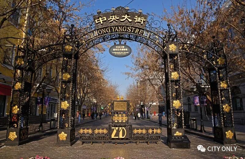 中央大街北起防洪纪念塔,南至经纬街口,旧名为中国大街。因光绪二十四年(1898年)开始修筑中东铁路哈尔滨段的中国劳工在此居住而得名,1928年更名为中央大街。当时沙俄的犹太商人最先嗅到商机,在这里开设了第一批商号: 犹太国民银行、道里秋林商店、马迭尔宾馆和餐厅、米尼阿久尔餐厅,这些都是犹太商人们的产业。如今商业依旧繁华,店家几度更换,建筑外部却还基本保留着最初的样子。如今每栋建筑都会标注保护牌来向人们传递这段历史。