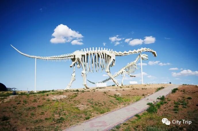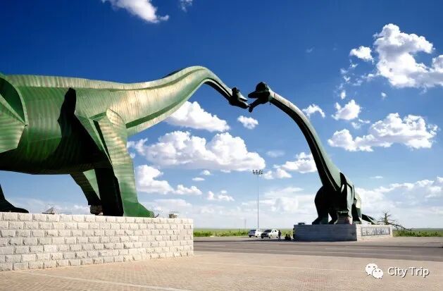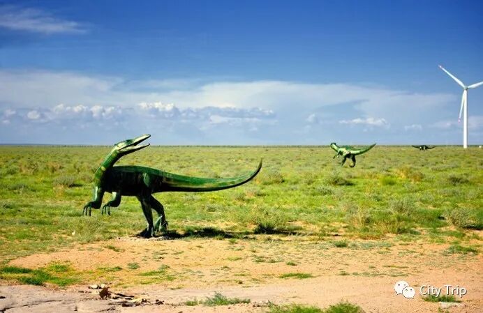 恐龙是二连浩特的另一张名片,见到戈壁滩上矗立着大大小小处于奔跑状态的恐龙模型,这就是白垩纪恐龙国家地质公园了。其附近一片白茫茫的额仁诺尔盐池(二连盐池),曾在此处发现过世界最大的恐龙--查干诺尔龙,这里也是亚洲最早发现恐龙化石的地方。