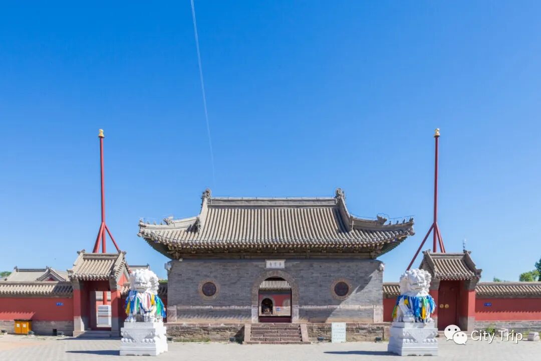 戏楼北侧的仪门前两根旗杆下有一对石狮,造型逼真;左右两侧的鼓楼与钟楼相对而立。向北进第三道门,过议事厅,两道屏风,装饰得古色古香。最后是大殿关公殿,注意门匾上写着“亘古一人”的字样;院内东西两侧配殿绘制有精美的三国人物故事壁画。如今的大殿偶尔开放,赶上正月十五这类的大日子,能确保开放。大戏台西侧还有一处晋商博物馆,主要展示多伦商会的纸币,以及介绍各地的山西会馆。一带一过,看看就好。
