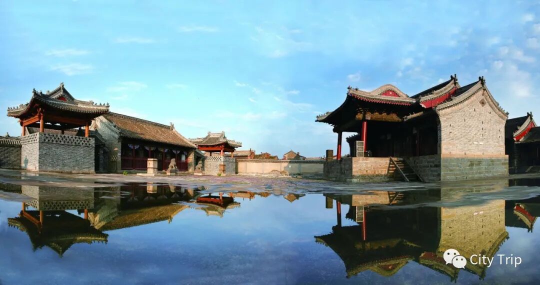 山西风格的建筑聚落大都为四进院落,大殿三座,主要建筑分布在一条中轴线上,左右对称。进第一道门便可看见一座极具特色的大戏台,戏楼坐南朝北,正中间悬挂着雕刻鎏金花边的“水镜台”匾额,此书为清代康熙年间的书法家傅山所留。戏台上悬挂着两面镜子,据说当年善因寺未被烧毁,可借角度看到寺庙全影,可惜的是善因寺早已废弃。