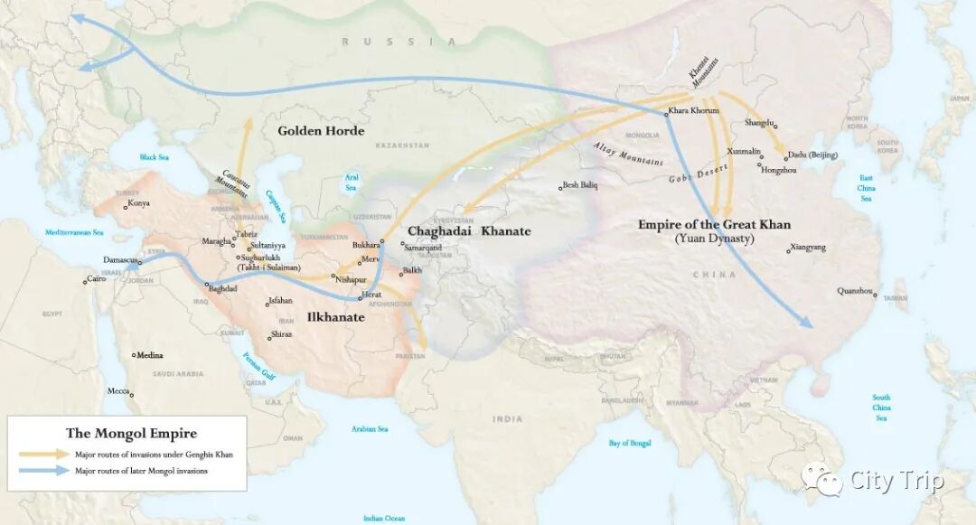 (蒙古帝国/元帝国扩张的主要路线/上都设立在大都以北)▼