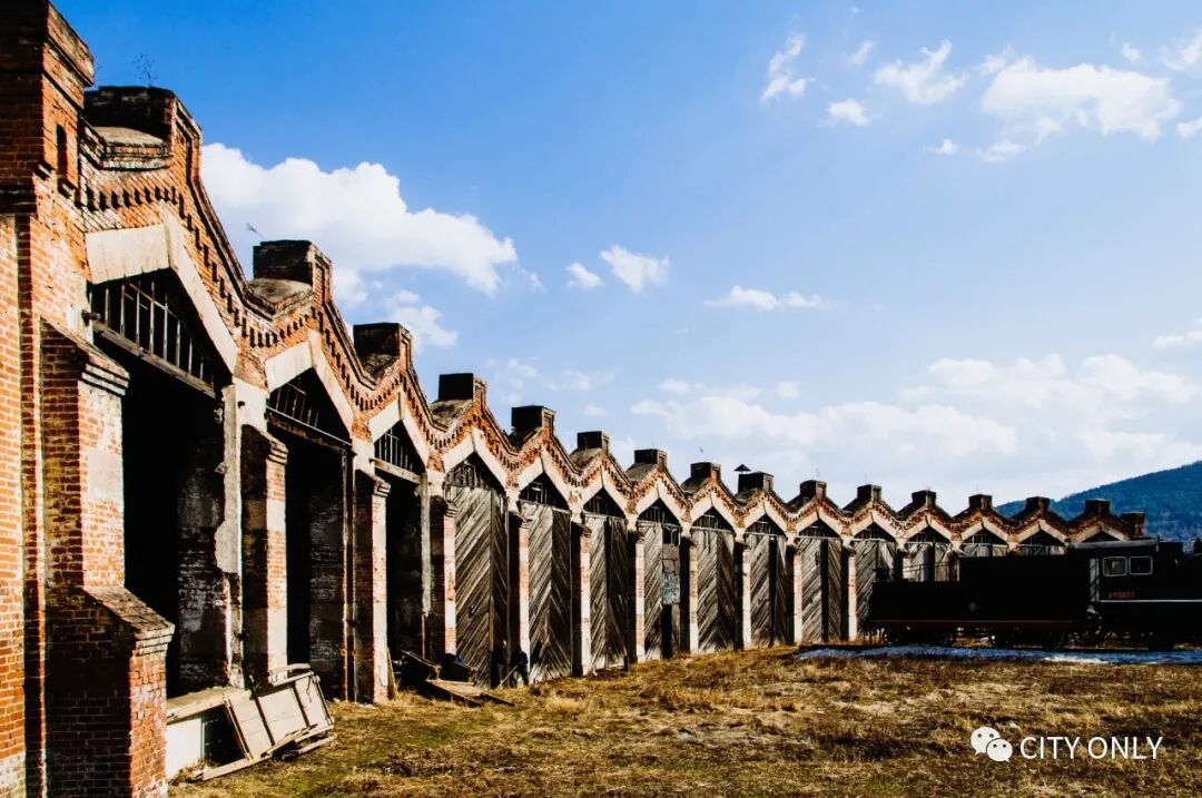 横道河子机车库建于光绪二十九年(1903年),建筑面积2160平方米。平面呈扇形,有15个车库紧密排列,圆顶相连如波浪,各有一个五六米高的尖拱形车库门,造型独特。15个机车停泊位置分别对着扇形圆心方向的机车调车台。这里在20世纪90年代便退出了历史舞台,如今“扇骨”已被拆除,停着一个车头可供拍照,调车台仅存半地下式圆形水泥基座。爬上国道对面的山坡可以俯拍机车库全景。