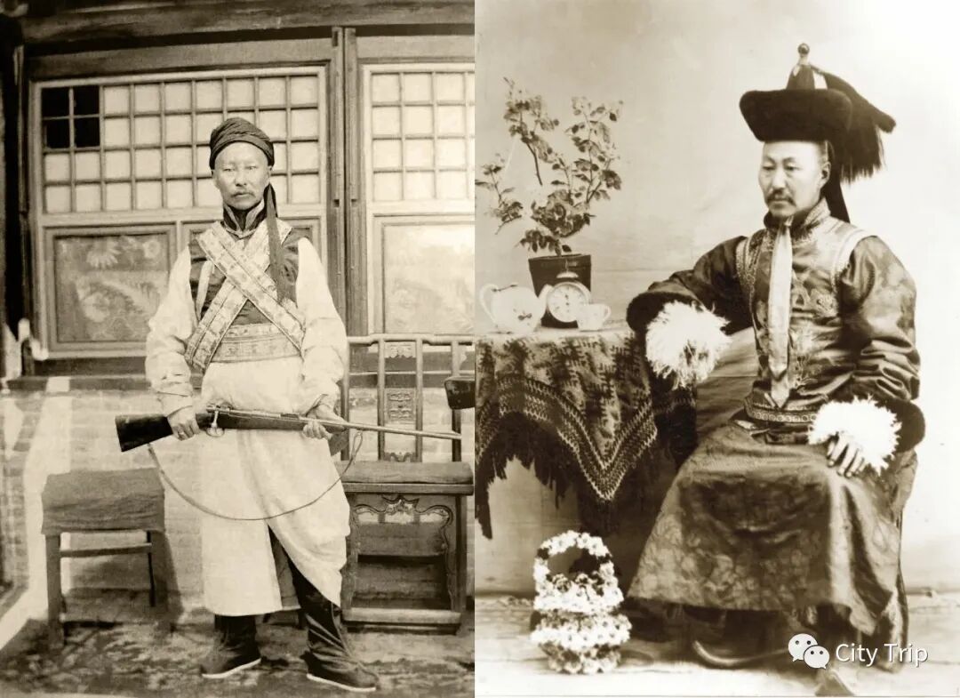(孛儿只斤·陶克陶胡戎装照-左/蒙古四等台吉陶克陶胡生活照-右)▼