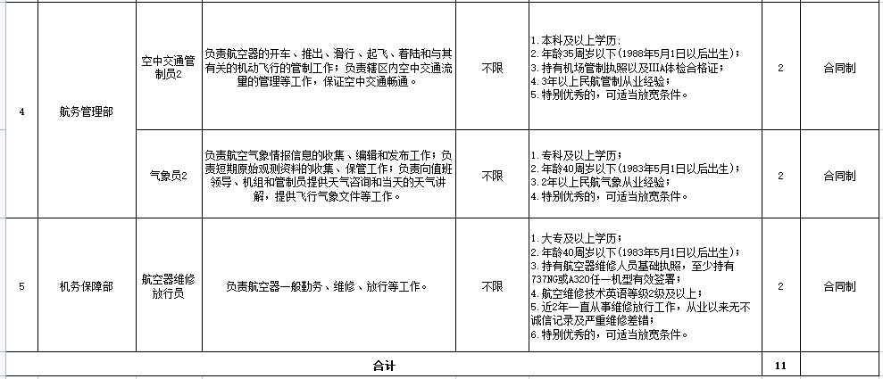 空中交通管制员4人、气象员3人、航空器维修放行员2人、青年储备人才2人。