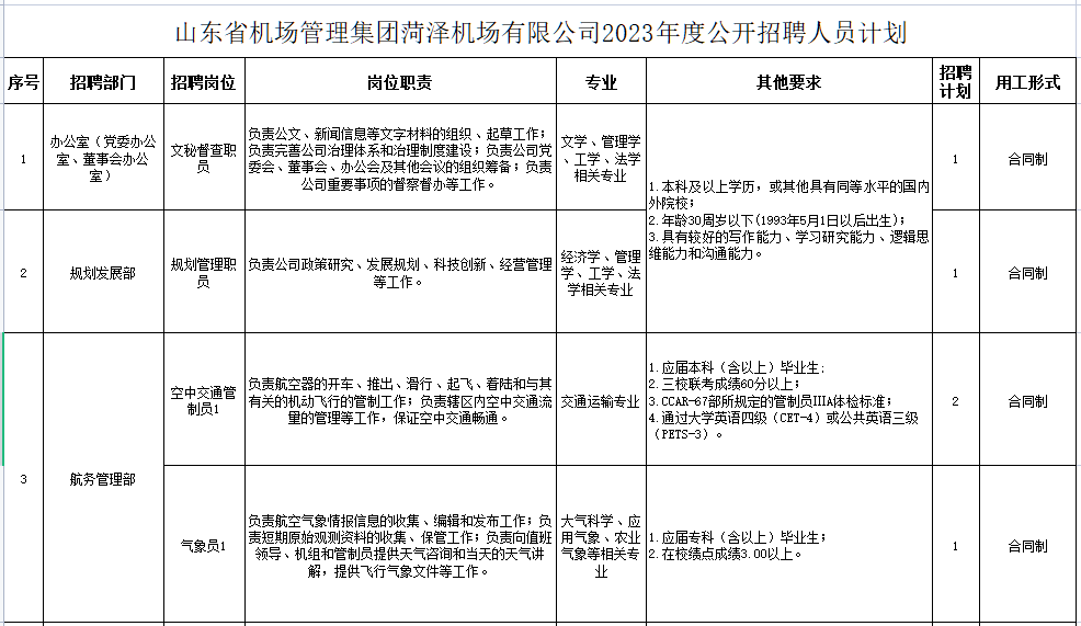 山东省机场管理集团菏泽机场有限公司招聘公告(含气象)