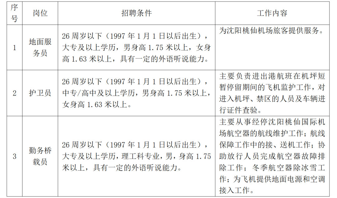 本次招聘岗位为地面服务员、护卫员、勤务桥载员。