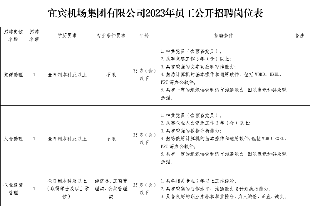 受宜宾市国有企业人力资源中心委托,宜宾人才发展集团有限公司按照公开、平等、竞争、择优的原则,面向社会公开为宜宾机场集团有限公司招聘3名工作人员。现将有关事项公告如下: