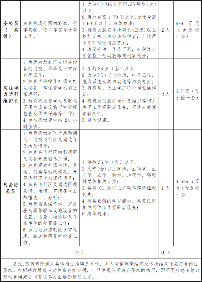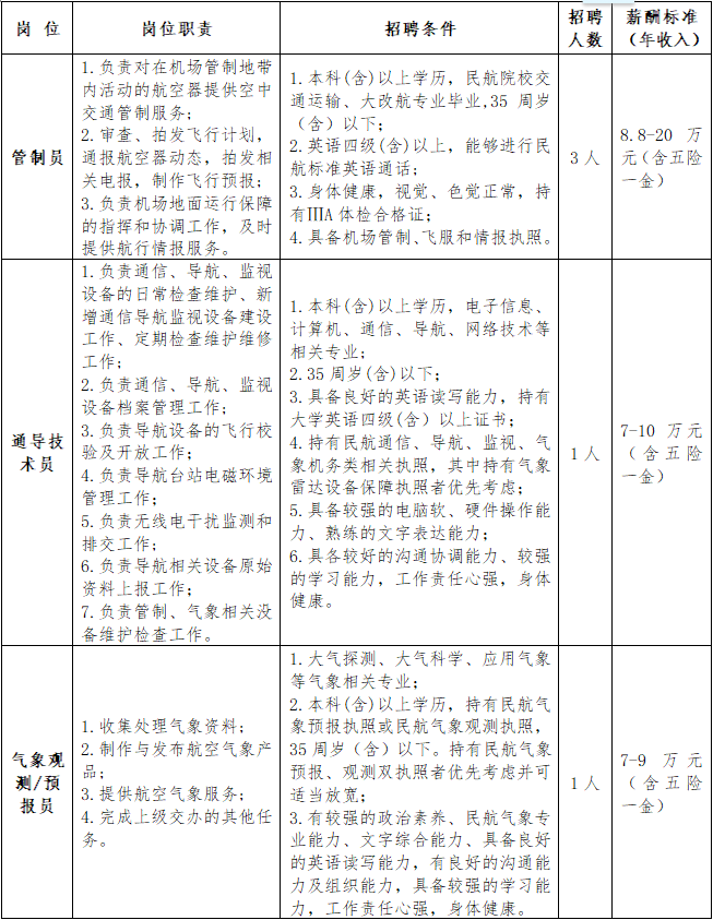 因工作需要,湘西边城机场现面向社会公开招聘管制员、通导技术员、气象观测/预报员、安检员(高级)、高压电力运行维护员、鸟击防范员等岗位人员。招聘有关事项公告如下。