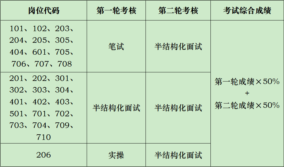 1.考核分为两轮,根据各岗位要求设置相应的考核方式。第一轮和第二轮成绩均为百分制,考核方式及计算方法如下: