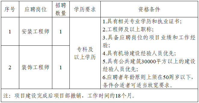 蚌埠机场建设投资有限公司是经蚌埠市政府批准设立的国有独资有限责任公司,负责蚌埠民用机场前期、建设、融资和运营管理。根据蚌埠民用机场建设需要,拟招聘项目部从事工程管理的专业技术人员,要求如下。