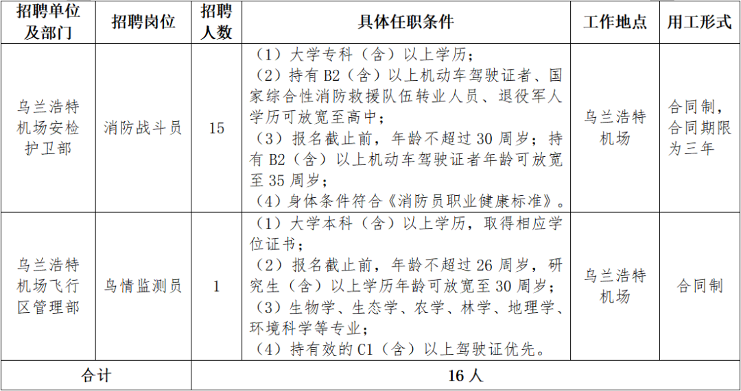 1.应聘鸟情监测员岗位人员与乌兰浩特机场签订固定期限劳动合同;