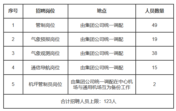 1.本次招聘人员数量上限为123人,本企业有权根据支线机场公司岗位空缺及通用机场投用情况随时调整招聘人数。