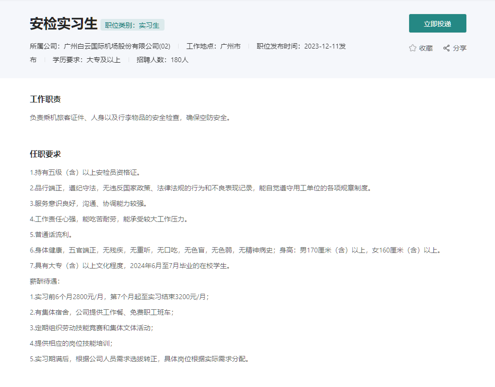 1.持有五级(含)以上安检员资格证。2.品行端正,遵纪守法,无违反国家政策、法律法规的行为和不良表现记录,能自觉遵守用工单位的各项规章制度。3.服务意识良好,沟通、协调能力较强。4.工作责任心强,能吃苦耐劳,能承受较大工作压力。5.普通话流利。6.身体健康,五官端正,无残疾,无重听,无口吃,无色盲,无色弱,无精神病史;身高:男170厘米(含)以上,女160厘米(含)以上。7.具有大专(含)以上文化程度,2024年6月至7月毕业的在校学生。薪酬待遇:1.实习前6个月2800元/月,第7个月起至实习结束3200元/月;2.有集体宿舍,公司提供工作餐、免费职工班车;3.定期组织劳动技能竞赛和集体文体活动;4.提供相应的岗位技能培训;5.实习期满后,根据公司人员需求选拔转正,具体岗位根据实际需求分配。