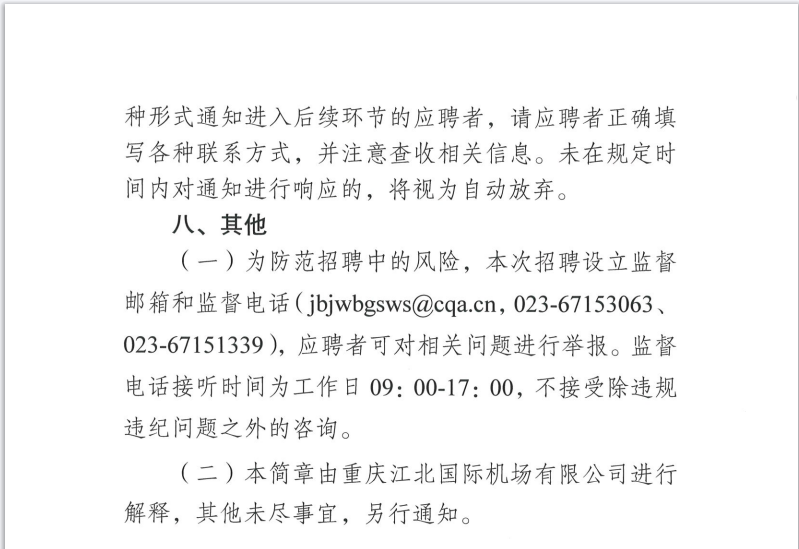 根据工作需要,重庆江北国际机场有限公司面向社会公开招聘相关岗位人员。我司未委托任何第三方招聘机构或中介开展招聘活动, 招聘报名不收取任何费用。