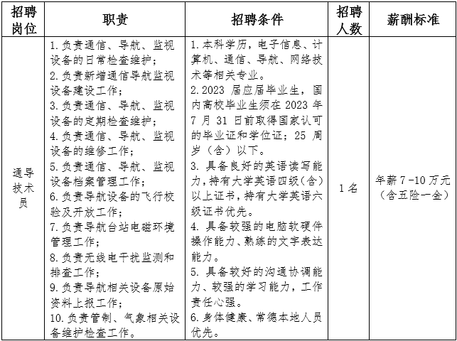 常德桃花源机场分公司隶属于湖南省机场管理集团有限公司,是省属国有企业。作为湖南省主要支线机场,常德桃花源机场2019年旅客吞吐量已超过100万人次,因机场工作需要,现计划面向校园招聘通导技术员1名(2023届应届毕业生),具体事宜如下: