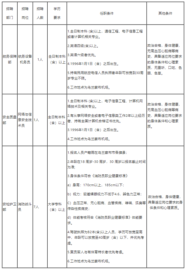 现根据机场公司业务发展需要,内蒙古乌兰察布民航机场有限责任公司面向社会公开招聘9名工作人员,详情如下: