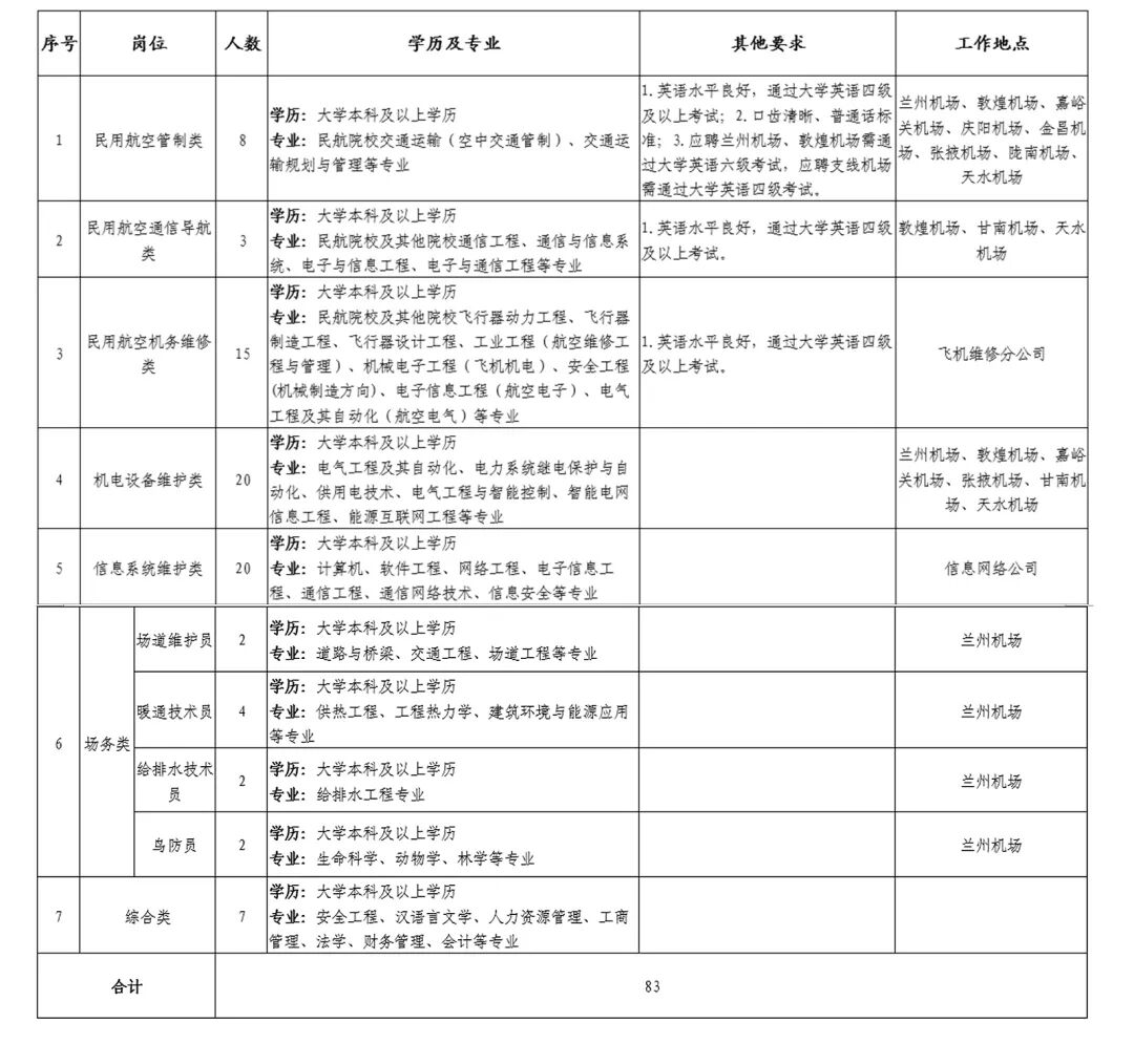 2.甘肃省民航机场集团有权根据岗位需求变化及报名情况等因素,调整、取消或终止个别岗位的招聘工作,并对本次招聘享有最终解释权。